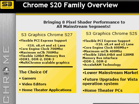 Анонсируя линейку графических чипов Chrome20, в которую на данном этапе входят два графических процессора - Chrome S27 и Chrome S25 (или просто S27 и S25), S3 Graphics с самого начала не обещала златых гор и экстремальных показателей производительности. Чипы S27 и S25 позиционируются компанией как решения для среднего и low-end секторов рынка современной графики соответственно. Тем более, что с самого начала было известно: S25 и S27 поддерживают только Shader Model 2.0+, в них не будет реализована поддержка SM3.0.