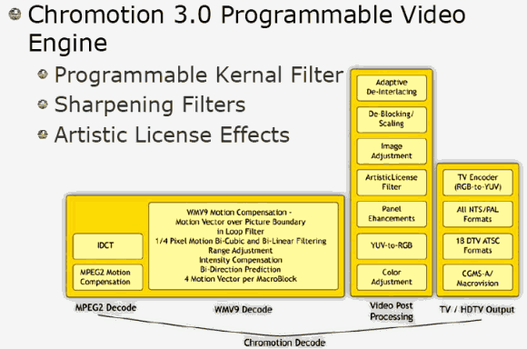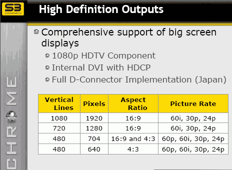 И, наконец, полный комплект вспомогательных функций. Даже не обладая пиковой производительностью в 3D играх, карточки на чипах Chrome S27 и Chrome S25 оснащены полным "джентльменским" набором технологий для работы в составе вполне современных "цифровых домов" в том числе, а этот аргумент, в сочетании с ценой, нынче далеко не последний при выборе системным интегратором комплектации для своих новых платформ. Сочетание всех этих факторов плюс производства с использованием современного 90 нм технологического процесса компании Fujitsu, с применением low-k диэлектриков и без применения свинца, позволило создать недорогие универсальные 3D чипы с неплохим показателем "производительности на ватт".