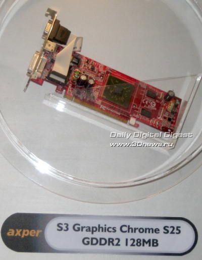 Что касается low-end графических процессоров S3 Graphics Chrome S25, они также используются для выпуска карт с шиной PCI Express х16, x8, x4 и x1, при этом тактовая частота ядра достигает 600 МГц и более (mClk 400 МГц). Шина памяти S25 может конфигурироваться как 32-битная, 64-битная и 128-битная, при этом поддерживается до 128 Мб памяти DDR1, DDR2 или технология AcceleRAM Technology, схожая с турбо-технологиями ATI и NVIDIA, когда в дополнение к установленной на графической карте памяти используется распределённая системная память - до 128 Мб в 32-битном режиме.
